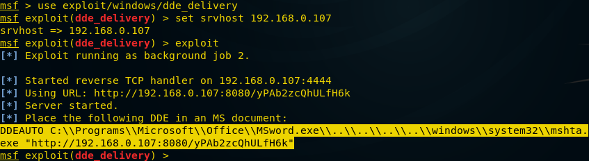 Now open a terminal and start Metasploit, once it starts, type “use exploit/windows/dde_delivery” and the exploit will load. Once that is done, all you need to do is set srvhost, this is the host IP. Once the exploit loads, type “set srvhost” followed by your IP, you can see what that would look like in the screenshot given below.