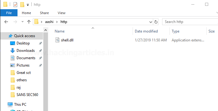 Next, we transfer this payload to the victim machine in a new folder named HTTP. This has to be HTTP and nothing else since we are including a path later on in the website link (that has HTTP in its URL). If the URL is prefixed by some other protocol like FTP, make the directory’s name as ftp. And it has to be in the current directory too. So we copy this shell.dll file into the victim machine.