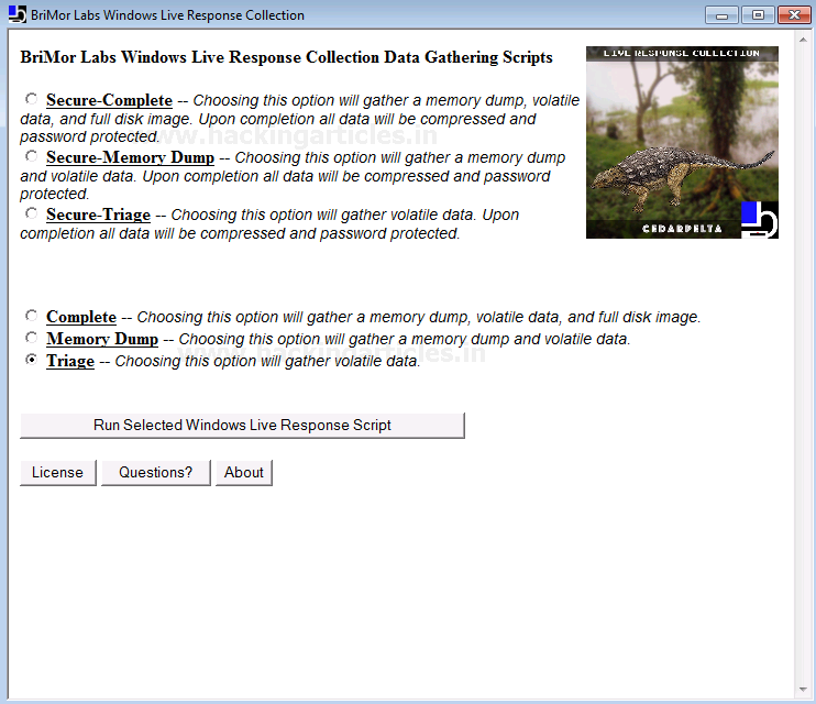 - Secure-Complete: Picking this choice will create a memory dump, collects volatile information, and also creates a full disk image. All the information collected will be compressed and protected by a password.