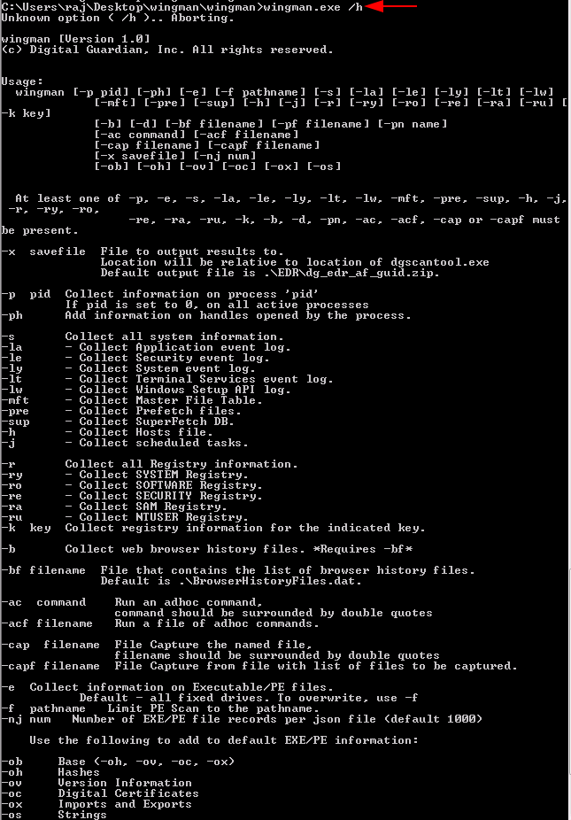 - Then, use the command wingman.exe/h, this gives you a rundown of commands along with their capacities.