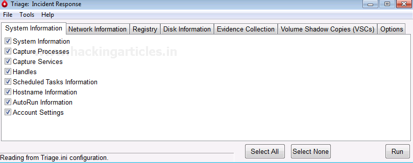 You can simply select the data you want to collect using the checkboxes given right under each tab. Triage IR requires the Sysinternals toolkit for successful execution.