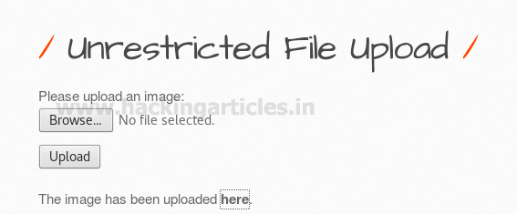 When the image gets successfully uploaded on the web server it will send the link of the directory where the image is saved to view the uploaded image. Since we haven’t uploaded any real image, therefore, we will try to execute our PHP backdoor by making click on the link “here”.