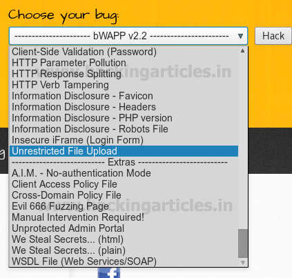 Set security level low, from the list box, chooses your bug select Unrestricted File Upload now and click on the hack.