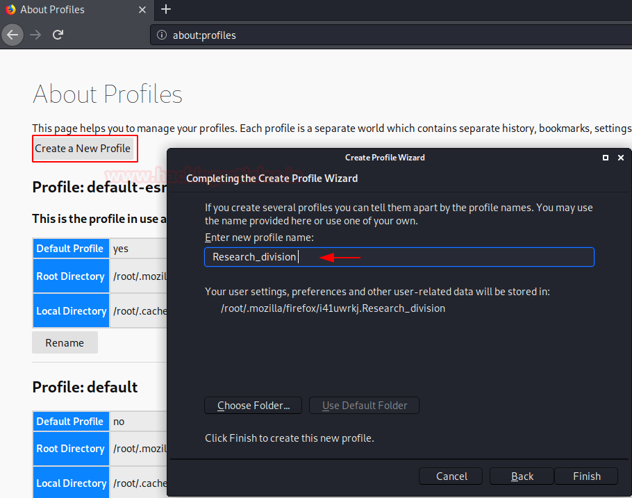 Once you click on “Create New Profile”, a dialogue box will open. Fill the name of the profile you want like here like we gave “Research_division”. After that click on the “Finish” button and the profile will be created.