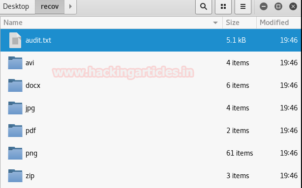 Now open the output (recov) folder, and you will see an audit report and six folders named by the file types we invoked Foremost to carve for us.