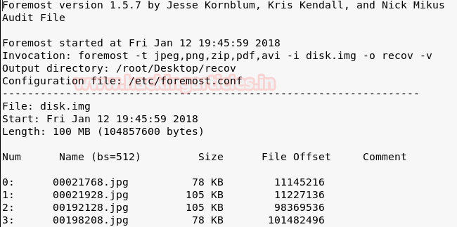 - The “-v” option instructs Foremost to log all the messages that appear on screen as the file carves into a text file in the output folder (recov) as an audit report.