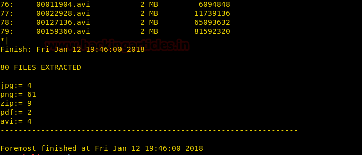 Type the following “foremost -t jpeg,png,zip,pdf,avi -i disk.img -o recov –v”.