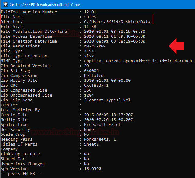 The last file we got is sales. Repeat the above steps just drag and drop this corrupted file on to [exiftool(-k).exe] to get its metadata details.
