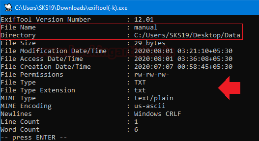 The fifth file we got is the manual. Repeat the previous step, to get metadata of this file drag and drop this corrupt file on the [exiftool(-k).exe] in the archive file which we just unzipped.