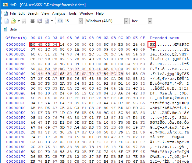 Then, try to match it first 4 bytes with our cheat sheet which we provide above. In a few moments, we find out that it is a .zip file with ASCII translation PK.