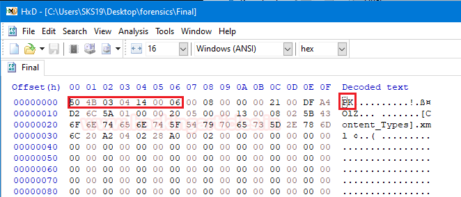 Finally, after opening that file, try to match its first seven bytes with our cheat sheet. In a few moments, we found out that its values match with a .docx file. So, it is a .docx file with ASCII translation PK.