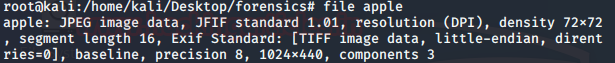 Then, let us try the same technique with the second file named apple. Apply [file] command and provide its file name. It shows that it is a jpeg image along with its internal pieces of information.