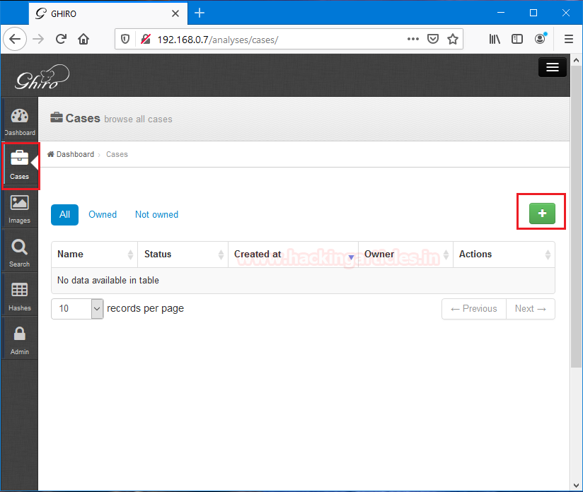 To start working with Ghiro for image analysis we need to click on cases. Where we can see that it is completely blank, then notice a [+] to add any case to this directory.