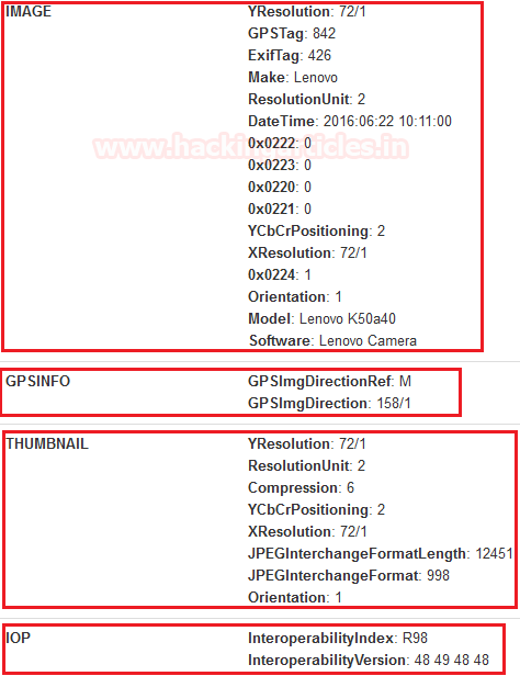 Scroll down to get full segments of the metadata of image files that can become handy in forensic investigation. Regarding GPS, Thumbnails, and IOP.