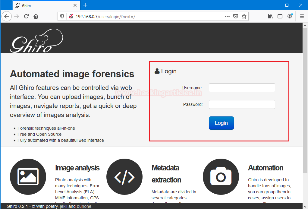 Username: ghiro Password: ghiromanager