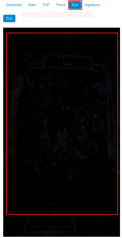 The fifth tab of Ghiro image analysis we get ELA. Error Level Analysis (ELA) permits identifying areas within an image that are at different compression levels. With JPEG images, the entire picture should be at roughly the same level. If a section of the image is at a significantly different error level, then it likely indicates a digital modification.