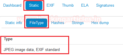 Click on the image we want to analyze, it will show us the basic details regarding the image in the dashboard which shows us all the analysis results like static analysis, EXIF, IPTC, XMP, Signature check, etc.