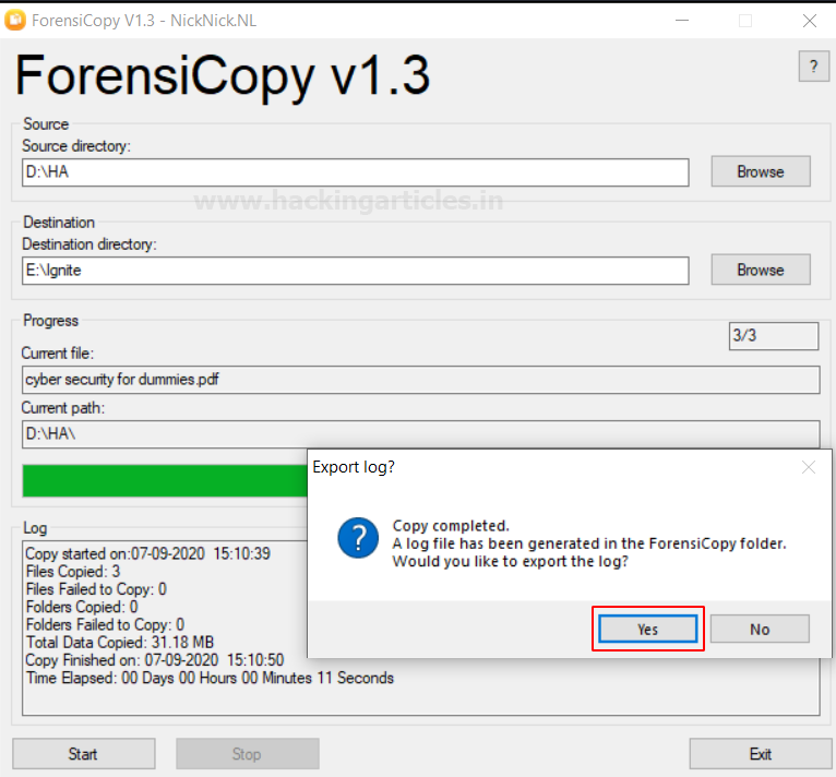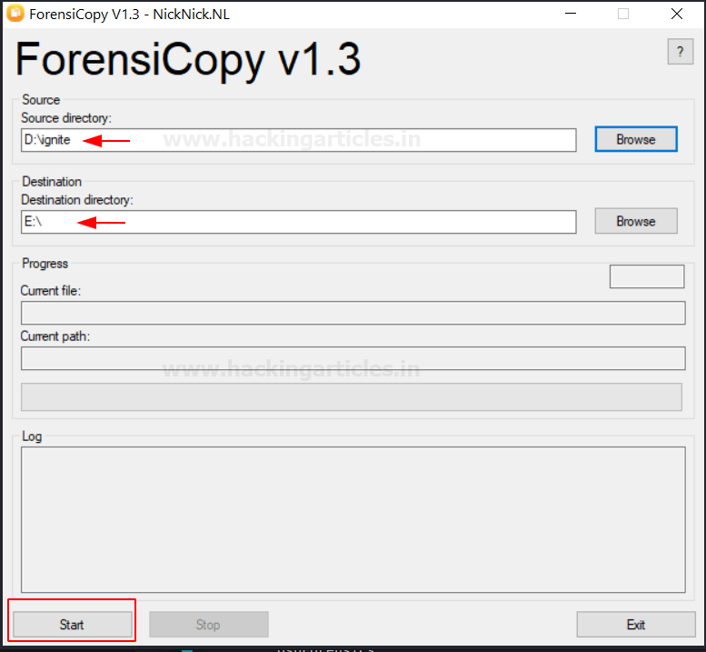ForensiCopy is an automated evidence copying software that is quite different from imaging. It can be downloaded from here. This tool copies the file from one location to the other without changing the timestamps. All you have to do is, add the path of the file, the destination of the file to copy and click on start. On completion, it will generate a log file.