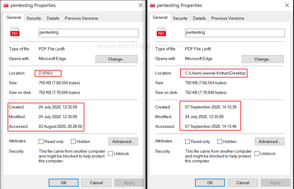 You can see that someone copied it to a new destination without the timestamp changing; to see the file information at the new path, type;
