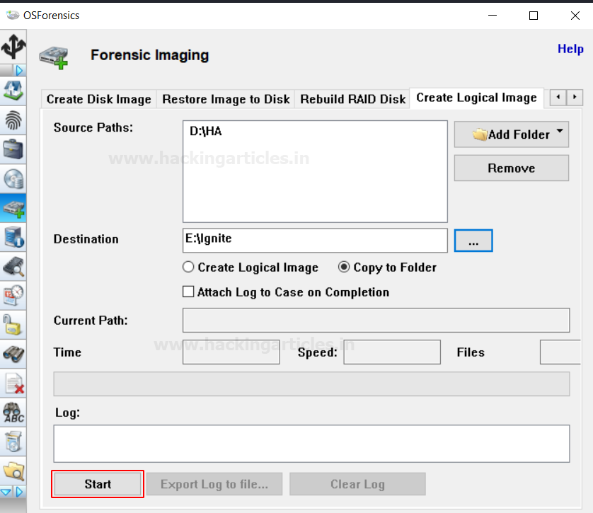 Then in this software, we call it Forensics Imaging by creating a Logical Image. In Logical Image, we copy only a portion of a drive bit by bit and keep the timestamp of the file/folder intact. Add the source and destination path of the folder and click on start.