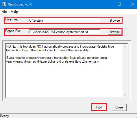 Now, follow the previous steps for RegRipper and select the location of the Hive file and Report file. Then click on the Rip! Button to start the Investigation process.
