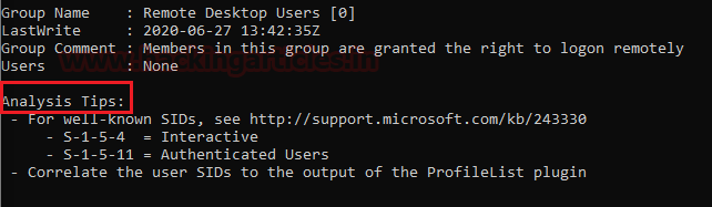 Some more group membership information, the group’s name like Users, System Managed Accounts Group, and Administrators. Their details revel Lastwrite, Group Comment, and Its Users.