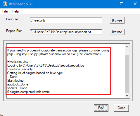 In the Hive file tab, we need to select the location where we saved our Registry hive file. In the Report file tab, select that location where we want our report and log file both saved. Then click on a rip button to get the report and log file.