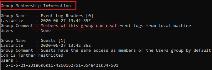 Next, we have spotted Group Membership Information. With its group name Guests and its details.