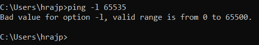However, we can add data as per our wish, as long as it remains under 65,535 bytes using the ping –l option in Windows. This also has some limitations. Let’s talk about them in the next section.