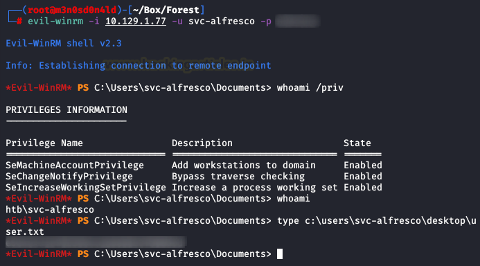 Then, we access the Windows system with the credentials obtained with an interactive connection through “Evil-Winrm“. We check the privileges of our user and read the flag of user.txt