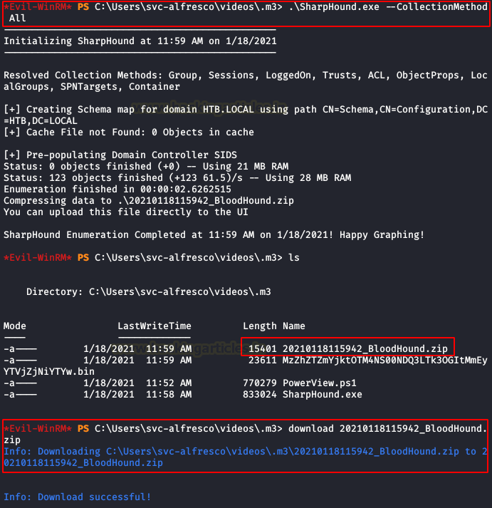 Once finished, we download the .zip file to our machine, so we can load it into our Bloodhound.