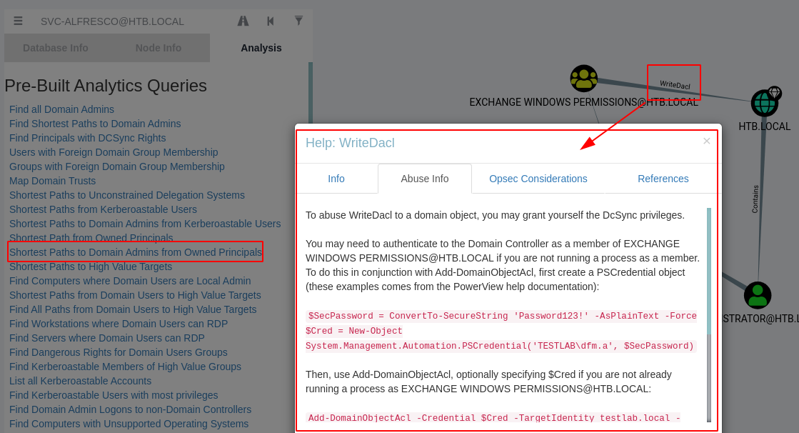 We look for our user and we use the query “Shorts Paths to Domain Admins from Owner Principals“, we see the way and we check that belonging to the group “EXCHANGE WINDOWS PERMISSIONS” we could use “WriteDacl” that would allow us to add users as members of the group “Domains Admin“.