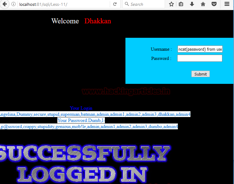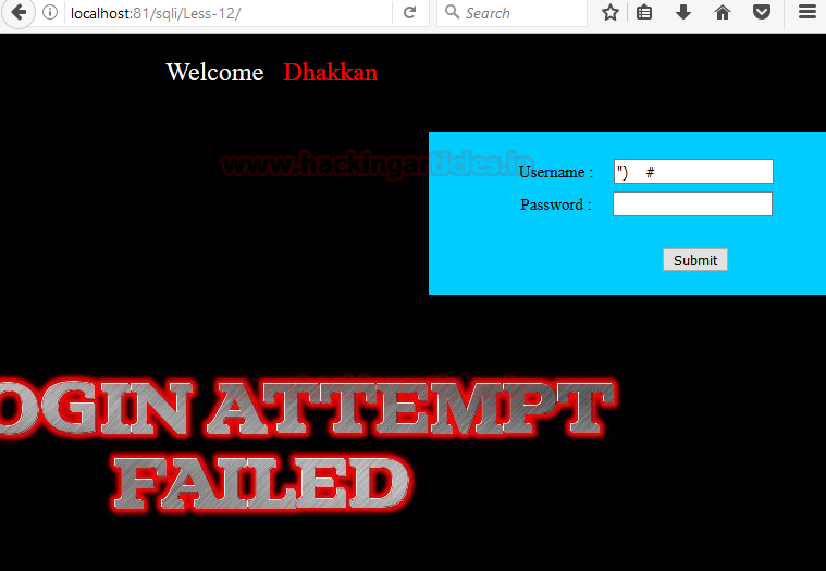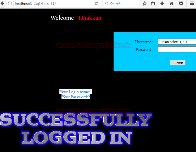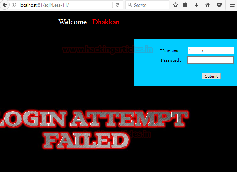 In our previous article we had performed Form Based SQL injection using sqlmap but today we are going to perform Form Based SQL injection in DHAKKAN manually. There are so many examples related to login form like Facebook login; Gmail login; other online accounts which may ask you to submit your information like username and password.