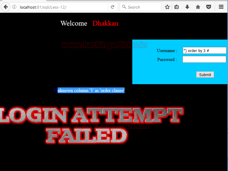 Lesson 12 is similar to previous lesson 11. But here you will face failure if you used single quotes for breaking the query. Since the chapter sound closed to post Error based double quotes string (“). Thus I had used double quotes (“) to break the query inside the text field of username then click on submit.