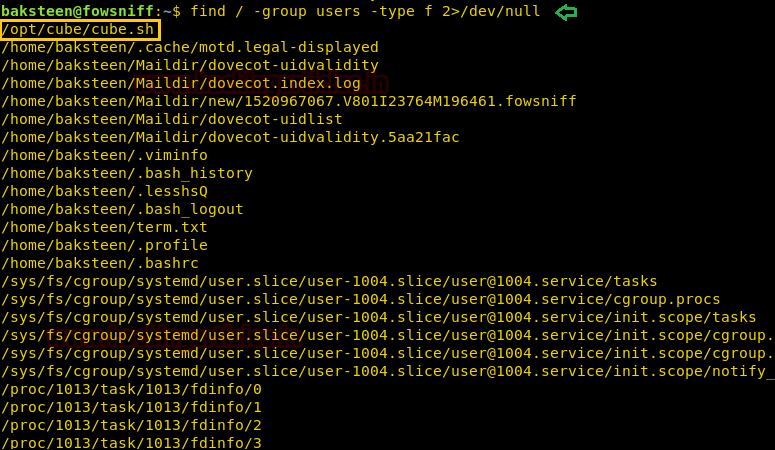 After gaining access we enumerate the system, as user “baksteen” belongs to two different groups. We use to try to find files that belong to the “users” group and find a file called “cube.sh”.