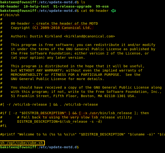 As when we login through SSH we get a banner similar to the one that “cube.sh” contains. So we check “/etc/update-motd.d/” directory to look for executables that might run this program and find that file “00-header” runs this shell script.