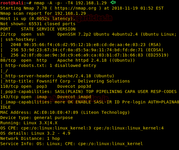 The NMAP output shows us that there are 4 ports open: 22(SSH), 80(HTTP), 110(POP3), 143(IMAP)