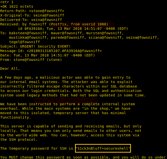 Its not clear on “We don’t find anything on the webpage. Dirb scan and Nikto also didn’t reveal anything, so we googled “fowsniff corp” and found a Pastebin link that contained username and passwords. (You can find the link here)”