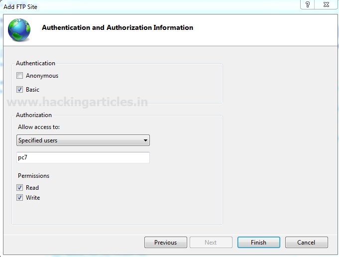 Allow following setting in Authentication and Authorization for your FTP site and then click on Finish.