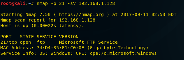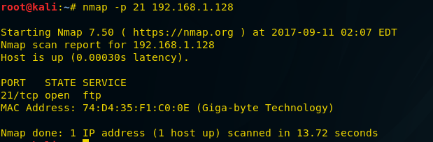 An attacker may take help of nmap to verify whether port 21 is activated or not. For FTP penetration, we are also using nmap in order to scan the targeted system (192.168.1.128) for open FTP port.