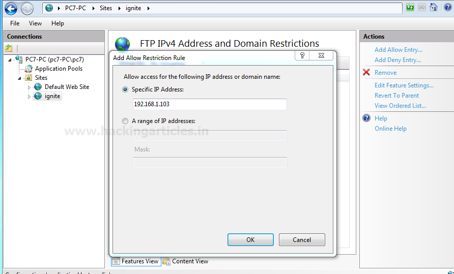 Now open FTP IPv4 Address and Domain Restrictions. Here we are going to allow only a particular IP address to access the FTP server. This will allow only valid IP to get connect with FTP.