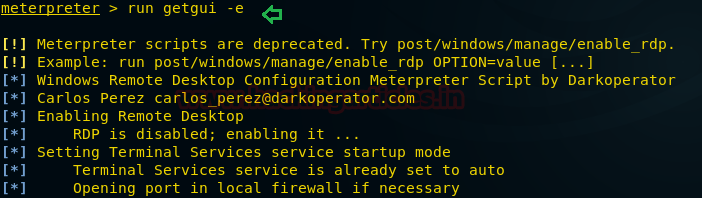 Open meterpreter session1 and type following command which will enable remote Desktop service in the pivoted machine.