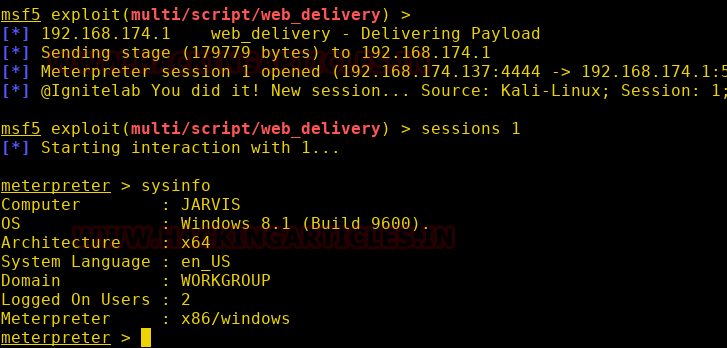Now, to test the real working of Notify, we will exploit a machine, so that we can observe, whether or not it will notify us, when we get a session. We are exploiting a Windows machine using web delivery.